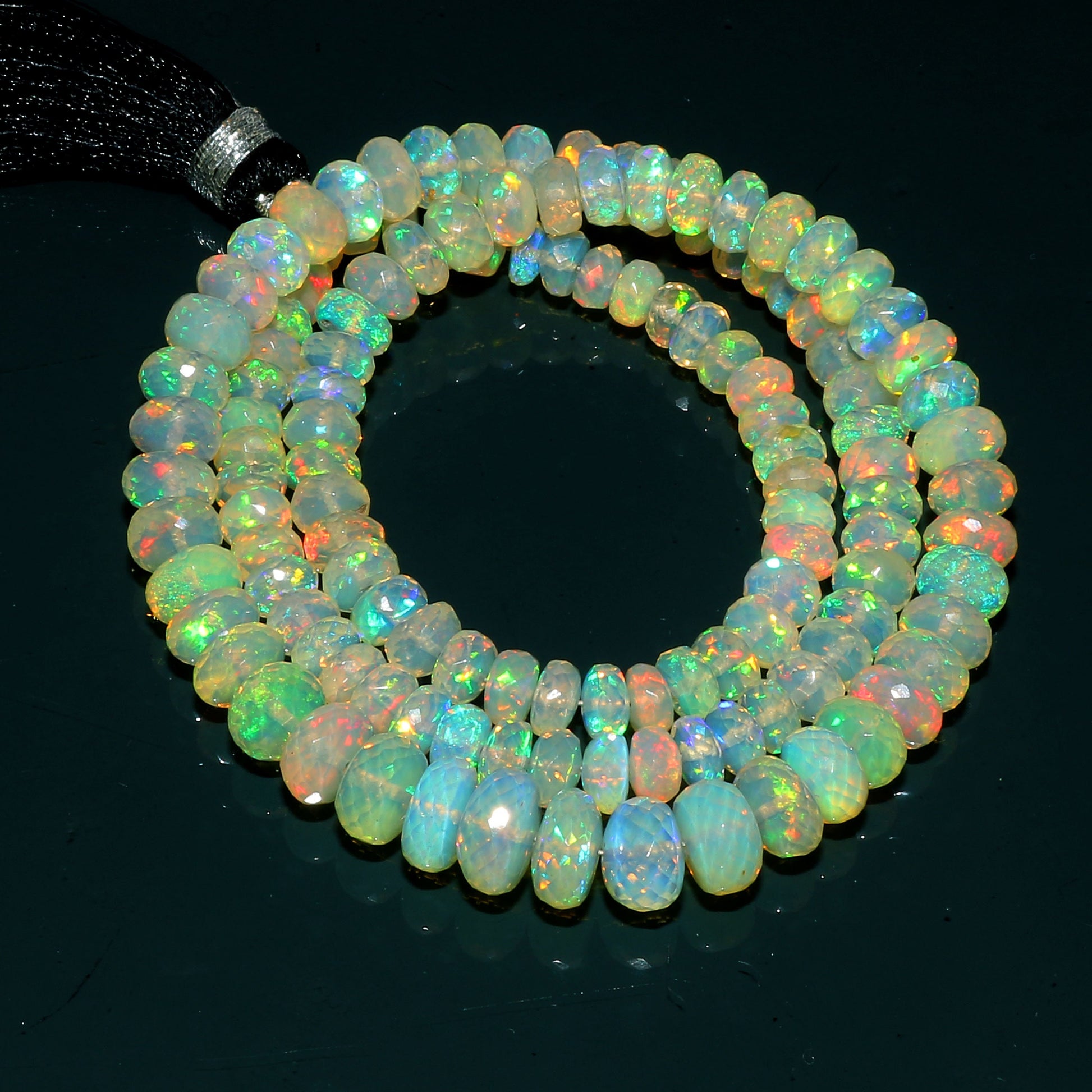 Experience the stunning beauty of AAA Natural Ethiopian Fire Opal beads sourced from Ethiopia. These faceted rondelle beads display exceptional transparency with vibrant blue, green and multi fire flashes that shimmer beautifully under light. The precise faceting enhances brilliance, making them perfect for fine and luxury jewelry creations.