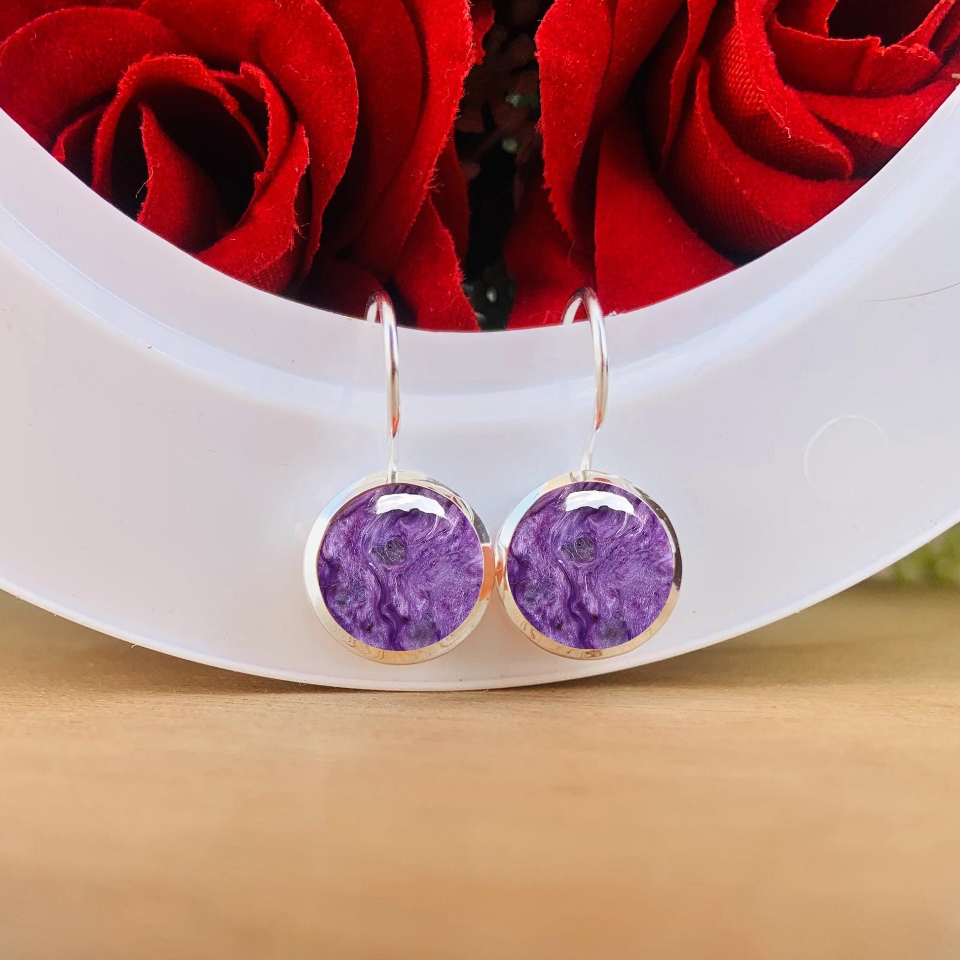 Natural Charoite Silver Earrings ~ Charoite Stone of Attraction ~ Round purple Stone ~ Gift For Mom ~ Birthday Gift ~ E-0013